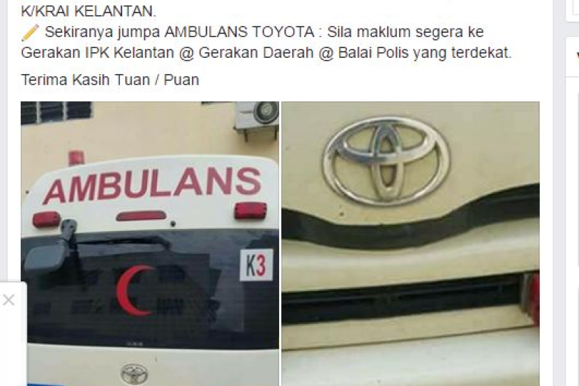 PETALING JAYA: Memuat naik status di Facebook untuk mencari kereta atau motosikal hilang sudah biasa dilihat di media sosial, tetapi agak pelik jika melihat status ambulans hilang. Dalam kejadian ini, sebuah ambulans milik Hospital Kuala Krai, Kelantan, dengan nombor pendaftaran BKL 5695, telah dilaporkan hilang pagi Rabu. Belum dapat dipastikan sama ada kenderaan ini telah ditemui atau sebaliknya. Disebabkan posting ambulans hilang ini dimuat naik di media sosial, netizens telah membuat beberapa andaian di ruang komen. Ramai yang mendakwa van tersebut telah dicuri oleh mereka yang terdesak untuk pulang beraya. "Dia pinjam buat balik kampung kot. Naik ambulans senang...on siren boleh laju sampai kampung," tulis Encik Misteri di laman Facebook Info Roadblock JPJ/Polis. Apit Mgs menulis: Ni kes nak balik kampung ni, tiket dah habis semua, kereta sewa pun tak ada, nak tumpang lori dah tak boleh, lori dah tak boleh jalan atas jalan dah, sebab tu rembat ambulans. Difahamkan, ambulans ini telah hilang di sebuah bengkel di Guchil, Kuala Krai dan kes ini pernah berlaku sebelum ini.