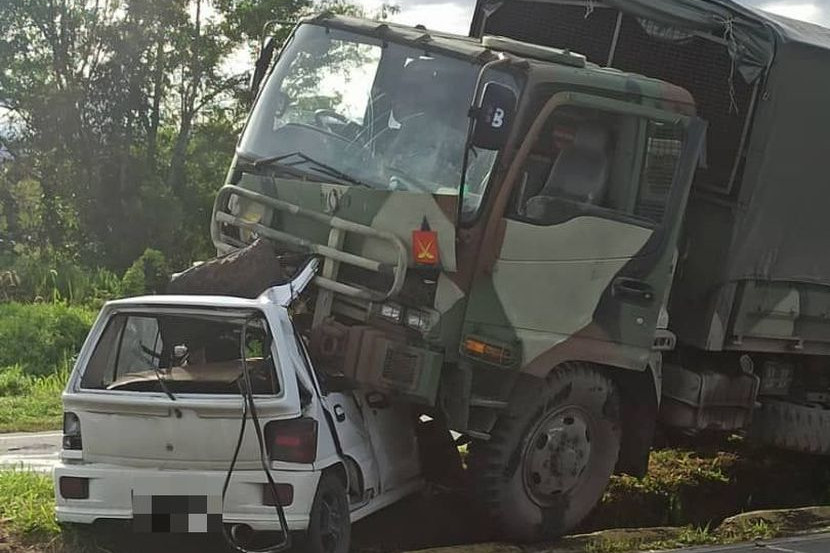 TIGA maut apabila sebuah trak tentera merempuh sebuah motosikal dan kereta yang yang dipandu seorang pegawai polis dalam satu kemalangan di simpang Marabahai Spurs, Jalan Berungis-Tenghilan pada pagi Sabtu. Ketua Polis Daerah Tuaran, Deputi Supritendan Mohd Hamizi Halim berkata, penunggang motosikal berusia 25 tahun, Jul Amri Shamsudin dan sepupunya, Yasa Samsudin, 35, yang merupakan pembonceng, meninggal dunia di tempat kejadian akibat kecederaan parah di kepala dan badan. Mangsa ketiga adalah seorang anggota polis berusia 45 tahun, Koperal Shamsully Adly. Difahamkan Shamsully yang memandu Perodua Kancil sedang dalam perjalanan pulang ke rumah selepas selesai bertugas di Balai Polis Kota Belud. Shamsully juga meninggal dunia di tempat kejadian akibat tersepit di dalam keretanya dalam kejadian yang berlaku pukul 8 pagi itu. Mohd Hamizi berkata polis sedang merakam keterangan pemandu trak milik Angkatan Tentera Malaysia (ATM) berusia 25 tahun yang terlibat dalam kejadian itu. Tambahnya, kes itu disiasat di bawah Seksyen 41 (1) Akta Pengangkutan Jalan 1987. Ujarnya, siasatan awal mendapati bahawa trak itu dari arah Tamparuli menuju ke Tenghilan. "Ketika tiba di lokasi kejadian, sebuah motosikal keluar dari simpang jalan Marabhai Spurs dan pemandu trak tidak dapat mengelak dan bertembung dengan mereka. "Akibat pertembungan itu, pemandu trak hilang kawalan lalu masuk ke laluan yang bertentangan, lalu merempuh kereta yang dipandu oleh anggota polis itu," katanya dalam satu kenyataan. -THE STAR