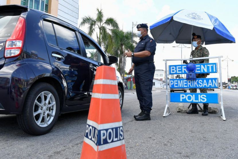 Polis mengadakan sekatan jalan raya untuk menguatkuasakan SOP ketika Perintah Kawalan Pergerakan (PKP) yang melarang pergerakan rentas daerah dan negeri.