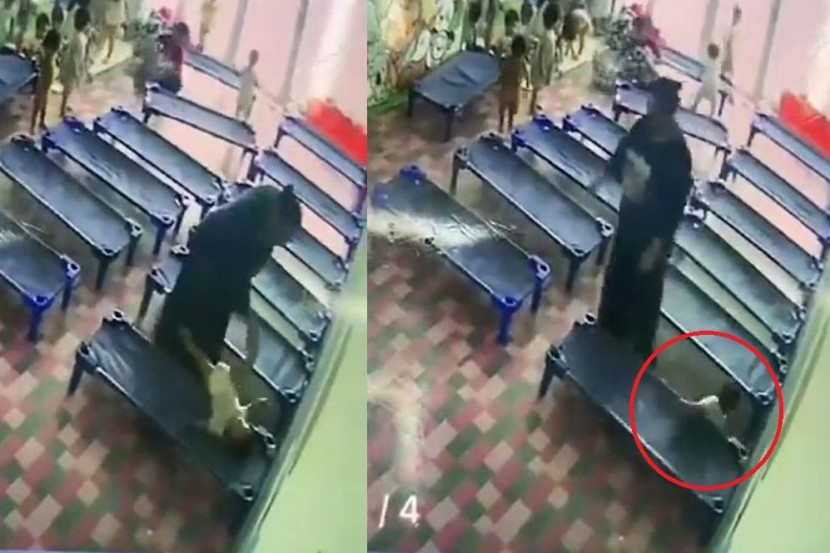 Salah seorang daripada wanita itu kemudiannya dilihat menarik kaki seorang kanak-kanak yang sedang tidur di atas katil.