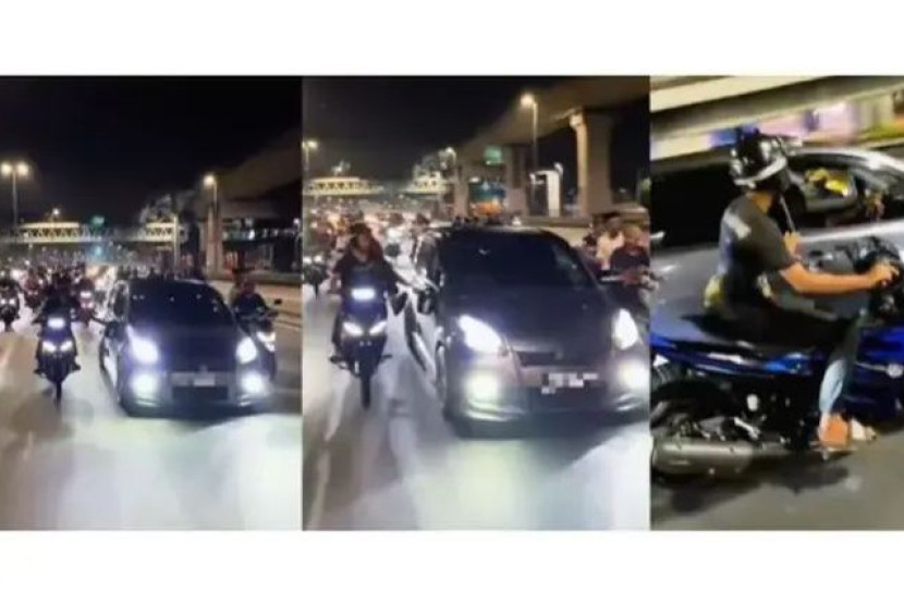 Dalam kejadian pada Ahad, kira-kira 20 penunggang motosikal dilihat mengepung sebuah kereta Myvi yang dipercayai sedang melarikan diri.