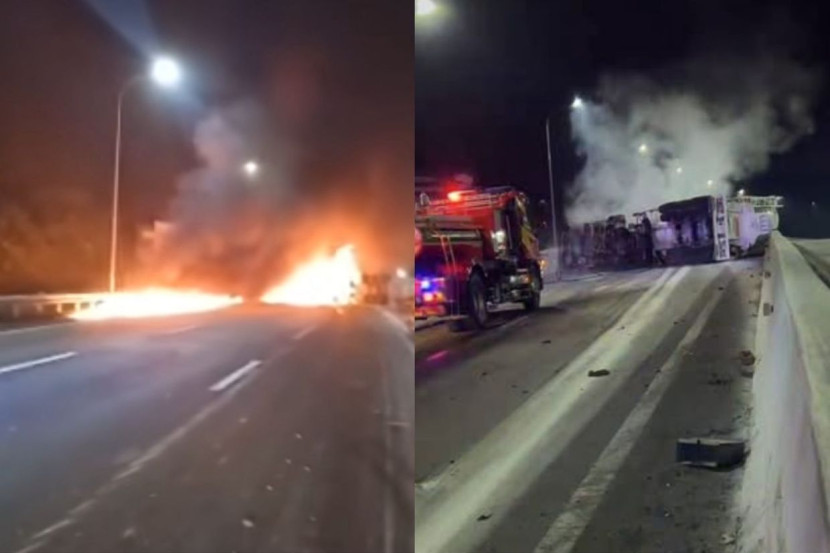 SEORANG pemandu lori rentung selepas kenderaan dipandu terbakar dalam kemalangan di kilometer (KM) 28 Lebuh Raya Karak dari Genting Sempah, Pahang menuju Kuala Lumpur, awal pagi Isnin.
