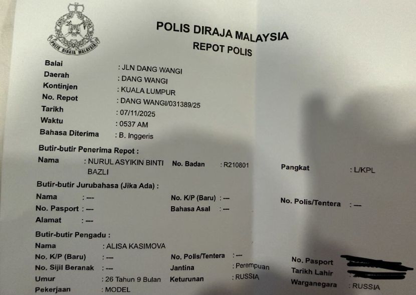 Pada masa sama, dia turut berkongsi salinan laporan polis yang dibuatnya di Ibu Pejabat Polis Daerah Dang Wangi pada pukul 5.37 pagi, Jumaat.