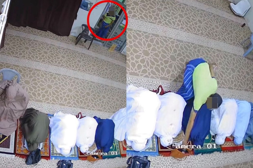 Video tersebut menunjukkan suspek yang memakai baju hijau, berkain pelikat biru dan berkopiah didapati berdiri di pintu masuk saf wanita sebelum bertindak mengambil beg ketika jemaah sedang sujud.
