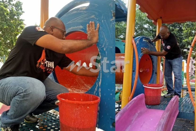 Mustaqim membersihkan peralatan di taman permainan itu kerana bimbang dengan kanak-kanak yang mudah terdedah kepada risiko jangkitan penyakit.
