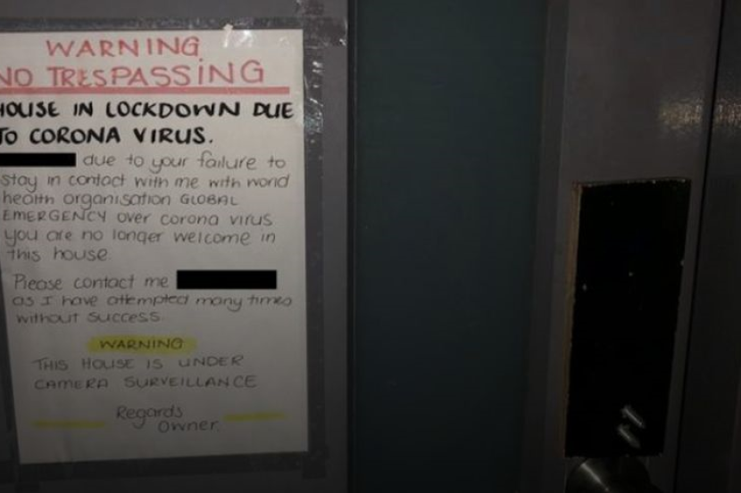 Notis yang ditulis tuan rumah itu berbunyi: "Dilarang menceroboh. Rumah dikunci kerana koronavirus. Disebabkan kegagalan untuk terus berhubung dengan saya berserta kecemasan global Pertubuhan Kesihatan Sedunia (WHO) mengenai koronavirus, anda tidak lagi diterima di rumah ini."