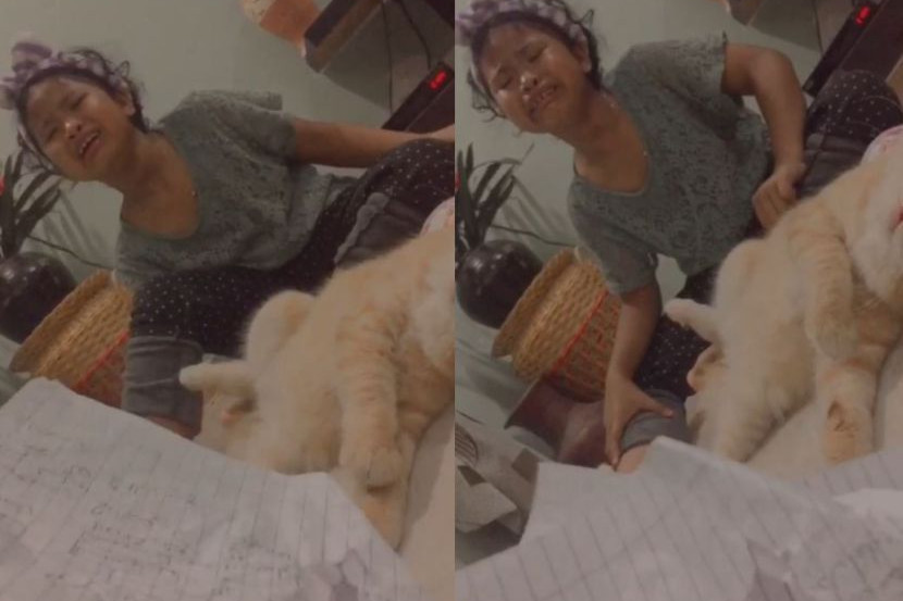 Dhia menangis selepas menyedari helaian buku kerja sekolahnya terkoyak angkara perbuatan kucing peliharaan keluarganya.