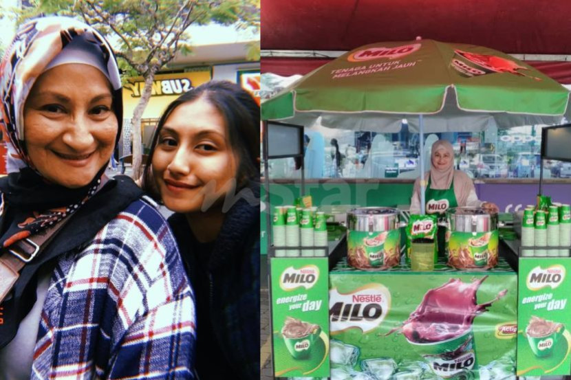 Gambar kiri menunjukkan Aminah (kanan) bersama ibunya yang menjual air minuman Milo di sekolah-sekolah. Gambar ihsan Aminah Farid