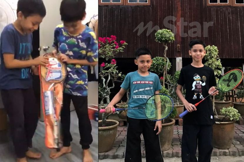 Dua beradik, Nik Fawwaz Fawzan (kiri) dan Nik Muhammad Haziq teruja menerima kejutan raket daripada abangnya. Foto ihsan Nik Muhammad Afiq Nik Kamaruddin