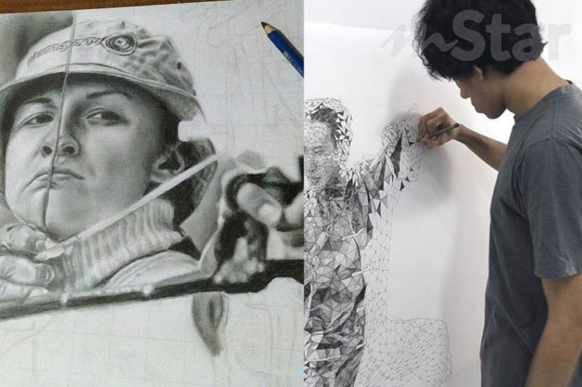 (gambar kanan) Noor Zahran membuat lakaran teknik low poly. (gambar kiri) Salah satu lukisan yang hilang semasa Diploma. Foto instagram NoorZahran