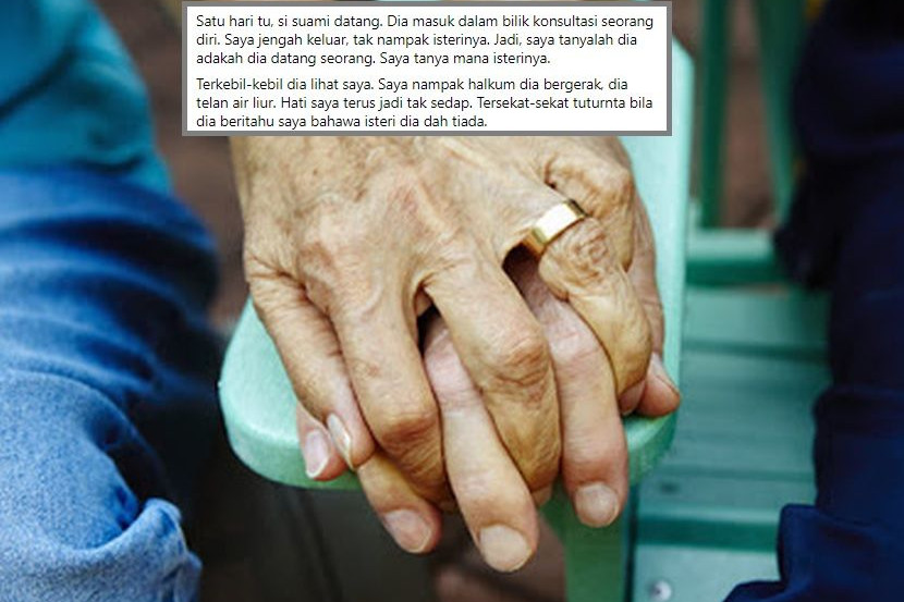 SETIAP pasangan suami isteri yang mendirikan rumah tangga pasti mengimpikan untuk hidup bersama meniti hari tua sehingga ke akhir hayat. Memasuki usia emas, pasti kebanyakan masa dihabiskan berdua memandangkan anak-anak sudah mempunyai hidup masing-masing. Melihat pasangan lanjut usia yang masih bergurau senda, berpegangan tangan dan saling mengambil berat antara satu sama lain, pasti terbit rasa gembira dan ingin mempunyai hubungan yang sama seperti mereka, sebagaimana perkongsian seorang doktor ini.ARTIKEL BERKAITAN: Doktor dedah ibu bapa tonjol teladan tak baik, paksa beri MC pada anak tak sakit... padahal bercuti, tak siap homework - “Ada pujuk, rayu sampai ugut” ARTIKEL BERKAITAN: Dimaki bodoh kerana rujuk buku, ibu pesakit dapat jawapan padu doktor... sudahnya dapat surat tunjuk sebab! - “Jimat masa, kurangkan human error” Menulis di Facebook, Dr Kamarul Ariffin Nor Sadan berkongsi kisah sepasang suami isteri warga emas yang benar-benar meninggalkan kesan mendalam kepadanya. Menurut Dr Kamarul Ariffin, pasangan yang berusia lingkungan usia 70 tahun itu menjadi pengunjung tetap kliniknya saban bulan untuk mengambil ubat. "Mereka datang setiap bulan untuk ambil bekalan ubat mereka. Dua-dua ada kencing manis dan darah tinggi. Si isteri tu kecil sahaja orangnya, kurus, tapi kalau bercakap, suaranya kuat macam halilintar. Kalau jumpa saya, ada saja dia nak cakapkan. "Si suami pula pendiam. Kalau dalam bilik konsultasi dia jarang bercakap. Dia akan berdiri sahaja di samping isterinya. Senyum bila isterinya melawak, mengiyakan bila isterinya bercerita. Dr Kamarul Ariffin Nor Sadan turut terkesan dengan kisah sedih pasangan warga emas berkenaan. "Si isteri selalunya balas begini 'Tolong suruh dia ni makan ubat, doktor. Pemalas makan ubat dia ni. Kalau tak piat telinga, mesti dia tak makan. Dah tua bangka pun kena paksa makan ubat, macam budak kecil. "OK OK OK, saya janji saya makan, ujar si suami. Terhibur tengok gelagat mereka berdua. Masih mesra bergurau walaupun dah berpuluh tahun berumahtangga. Cara mereka bergurau tu seolah-olah macam baru semalam mereka jatuh cinta," tulis doktor berkenaan sambil berkata kehadiran pasangan tersebut benar-benar membuatkannya gembira. Hinggalah pada suatu hari, kehadiran pasangan tersebut ke kliniknya tidak seperti sebelum ini, di mana hanya si suami sahaja berseorangan memasuki bilik konsultasi. Puas dijengah ke luar bilik konsultasi, namun kelibat si isteri yang suka berceloteh itu tetap tidak juga kelihatan. "Jadi, saya tanyalah dia adakah dia datang seorang. Saya tanya mana isterinya. Terkebil-kebil dia lihat saya. Saya nampak halkum dia bergerak, telan air liur. Hati saya terus jadi tak sedap. "Tersekat-sekat tuturnya bila dia beritahu saya bahawa isteri dia dah tiada. Bilik konsultasi terasa sangat sunyi. Rasa amat janggal. Biasanya ceria dengan celoteh isterinya. Hari ini semua itu tiada. Hati saya jadi sebak. Pasangan berkenaan sentiasa ceria dan riuh setiap kali bertemu Dr Kamarul Ariffin untuk mengambil ubat. Gambar hiasan "Kalau saya pun terkesan, saya tak dapat bayangkan betapa kosongnya jiwa si suami yang menanggung pilu bila insan yang mewarnai hidupnya selama puluhan tahun, tiba-tiba telah tiada bersamanya. Pasti sukar,"ceritanya mengimbas kembali pertemuan tersebut. Belum pun reda rasa sebak selepas mengetahui berita duka pemergian isteri lelaki berkenaan, kali ini doktor tersebut tidak lagi mampu menahan air matanya daripada berguguran apabila mendengar bait-bait kata si suami. "Ubat saya dah habis. Saya dah janji dengan dia. Kata-katanya tersekat kereta menahan sedu, bila sudah henti sedan, dia sambung Saya dah janji akan makan ubat."Saya seka air mata. Saya tak kata apa-apa. Tak tahu nak cakap apa. Kelu lidah. Teragak-agak nak respon bagaimana. Risau tersalah cakap. Lama juga kami berdua duduk diam membisu begitu. "Saya yang susah makan ubat, saya yang selalu culas, tapi dia yang pergi dulu, ujarnya tiba-tiba. Belum sempat saya balas apa-apa untuk mententeramkannya, dia bangun dari kerusi dan terus menuju ke pintu. Klinik Dr Kamarul Ariffin tidak lagi dikunjungi si suami sejak kali terakhir pada dua bulan lalu, selepas pemergian isterinya. Gambar hiasan. "Saya minta diri dulu, doktor, katanya sambil mengesat air mata dengan hujung lengan baju kemejanya. Lelaki tu beri salam, dan keluar dari bilik konsultasi. Itulah kali terakhir dia datang ke klinik saya," cerita doktor berkenaan. Menurut doktor itu lagi, sudah dua bulan berlalu sejak kali terakhir si suami datang ke klinik menjadikannya tertanya-tanya mengenai khabar lelaki tua berkenaan. "Saya doakan yang baik-baik sahaja buatnya. Semua pasangan akan hadapi saat ini nanti, termasuk saya. Adakah saya mampu hadapinya? Entahlah. "Pada yang masih ada pasangan tu, jangan pernah culas menyintai pasangan kalian setiap hari. Tak usah bila dah tiada peluang meluahkan kasih dan sayang, baru hendak merindui," tulisnya lagi. Sehingga kini berkongsian tersebut meraih melebihi 4,000 shares.Nak macam-macam info? Join grup Telegram mStar!