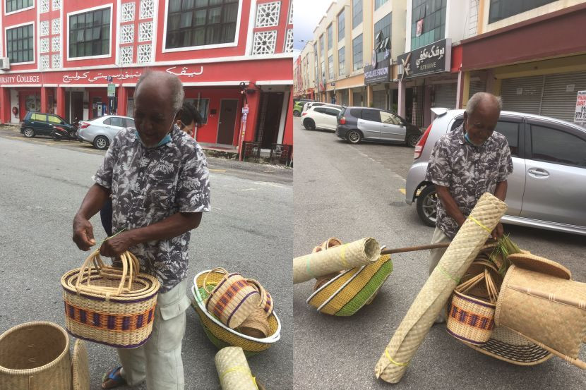 Lelaki tua berusia 76 tahun ini berasal dari Tumpat dan meniagakan hasil kraftangan di sekitar Kota Bharu dengan berjalan kaki. Foto: Twitter tashortyy