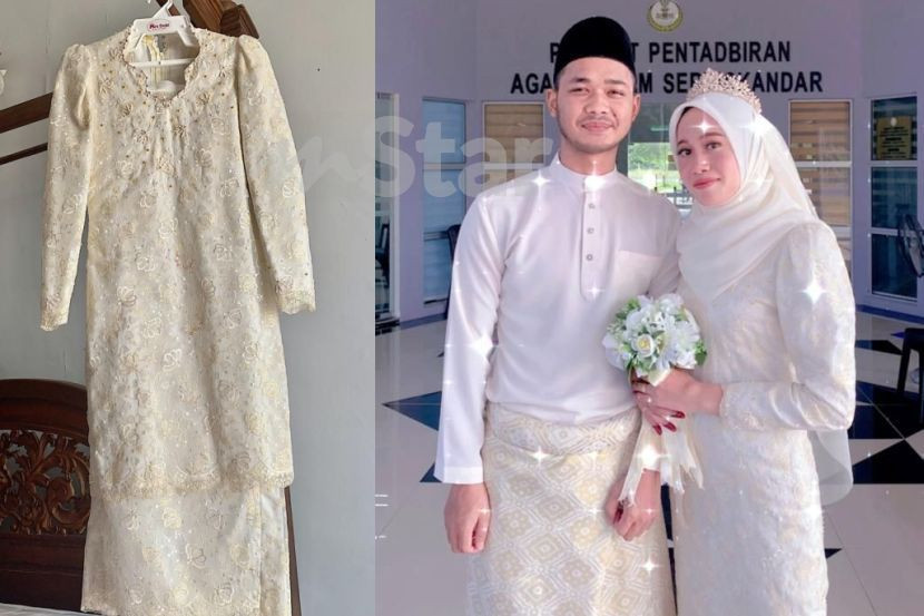 (gambar kiri) Baju nikah arwah ibu Ena. (gambar kanan) Ena (kanan) dan suami bernikah pada 6 Oktober 2020.