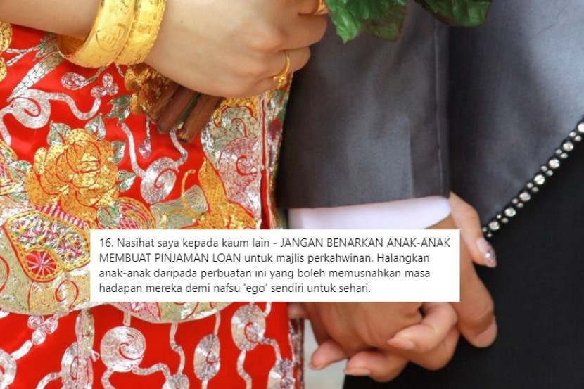 "Nasihat saya kepada kaum lain, jangan benarkan anak-anak membuat loan untuk majlis perkahwinan. Halang anak-anak daripada perbuatan ini yang boleh memusnahkan masa hadapan mereka demi nafsu 'ego' sendiri untuk sehari," kongsinya lagi.
