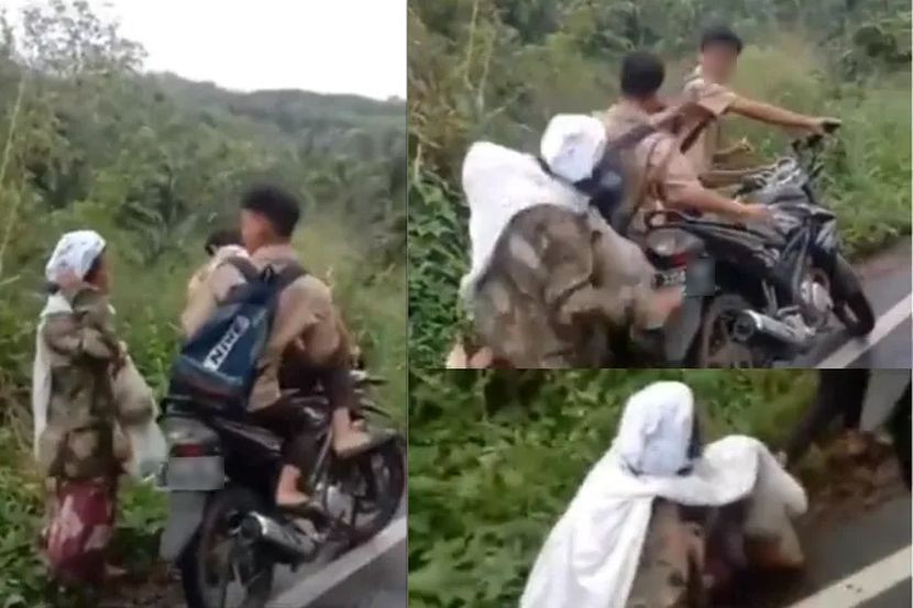 Salah seorang daripada pelajar yang membonceng motosikal menadah tangan di hadapan wanita itu seperti meminta sesuatu.