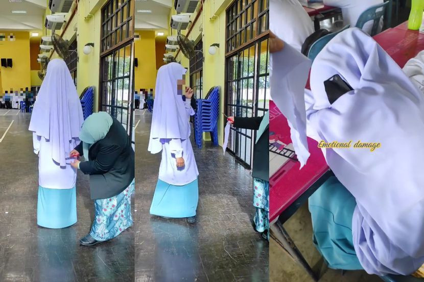 Menerusi video yang tular, guru terbabit dilihat memotong bahagian bawah tudung pelajar berkenaan di sebuah dewan sekolah.