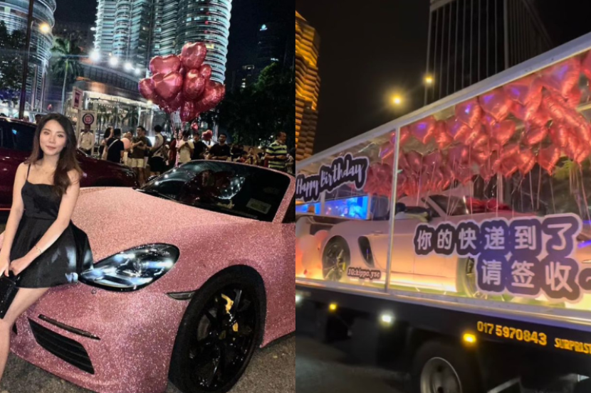 Menurut World of Buzz, wanita itu terkejut melihat lori kontena lutsinar dipenuhi belon merah jambu dan membawa Porsche berwarna pink pastel.