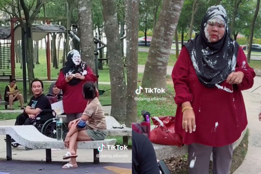Selain itu, tudung hitam yang dipakai wanita itu turut dipenuhi dengan kek putih yang telah hancur.