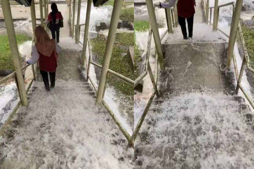 Menerusi satu video yang tular di aplikasi TikTok, kelihatan air hujan mencurah-curah menuruni tangga di kawasan berbukit di kampus berkenaan, seolah-olah ia kelihatan seperti taman tema.