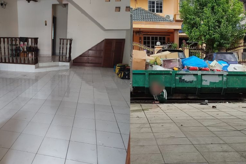 "Saya dan suami bersihkan rumah dua tingkat yang penuh dengan sampah, satu RoRo sampah. Kena angkat pula satu dapur gas berat dan buang dalam tong tu.