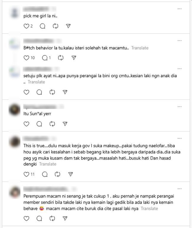 Dalam pada itu, ramai yang turut berkongsi situasi sama di tempat kerja masing-masing selain menasihatkan agar wanita yang bekerja supaya menjaga batas pergaulan untuk mengelakkan fitnah.