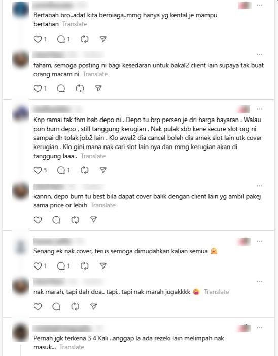 Dalam satu hantaran yang dimuat naik di media sosial, seorang jurufoto meluahkan rasa kecewa dengan tindakan kliennya yang tidak memaklumkan lebih awal tentang pembatalan majlis, sekali gus mengakibatkan dia menanggung kerugian.