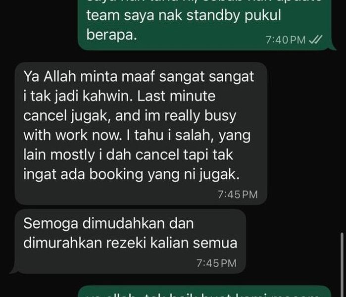 Dia turut memuat naik tangkap layar (screenshot) mesej daripada kliennya di aplikasi WhatsApp, yang memaklumkan pembatalan majlis kahwin dan mengakui kesilapan kerana terlupa memaklumkan tentang perkara tersebut.