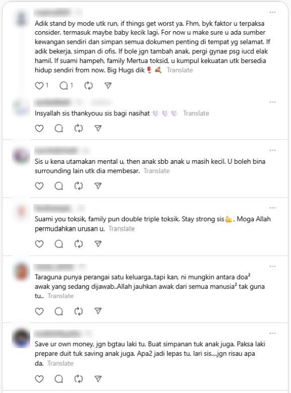 Di ruangan komen, rata-rata netizen meluahkan rasa simpati terhadap wanita tersebut dan mengecam tindakan keluarga mentuanya yang dianggap sebagai punca keretakan rumah tangga mereka.