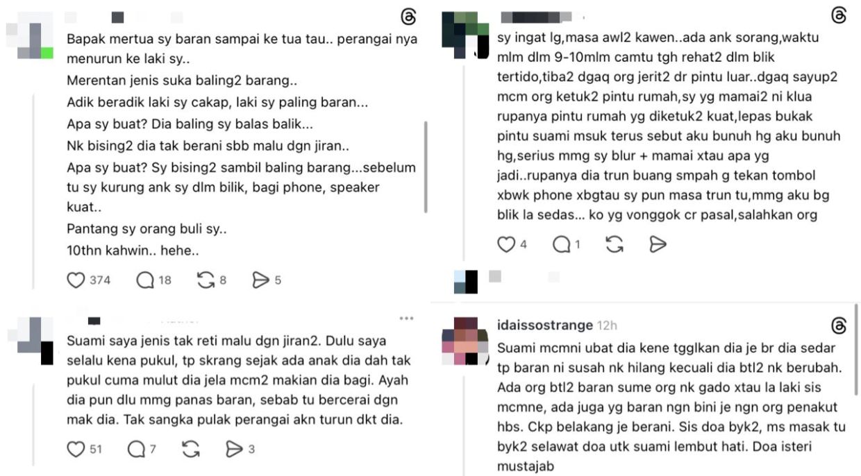 "Dengan orang lain dia penakut habis. Cakap belakang je dia berani. Awak doa banyak-banyak. Masa masak tu selawat dan doakan suami lembut hati. Doa isteri mustajab," komen seorang netizen.