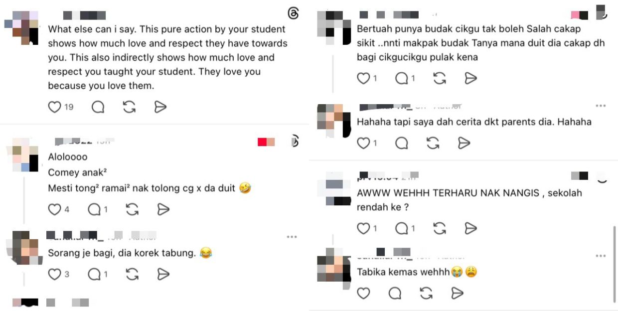 "Tapi pada keesokan pagi, salah seorang daripada mereka letak duit ni. Dia cakap... duit ini saya bagi cikgu sebab semalam kata dah tak ada duit. Tak tahu nak menangis ke apa," ujarnya.