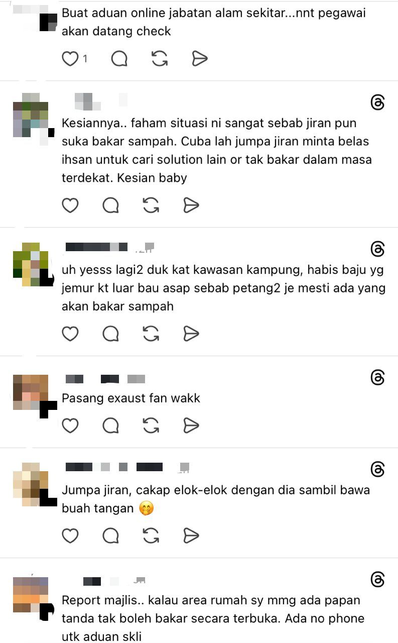 "Kasihannya, faham situasi ni sangat sebab jiran saya pun suka bakar sampah. Cuba jumpa jiran minta belas ihsan untuk cari jalan penyelesaian atau tak membakar dalam masa terdekat," komen beberapa netizen.