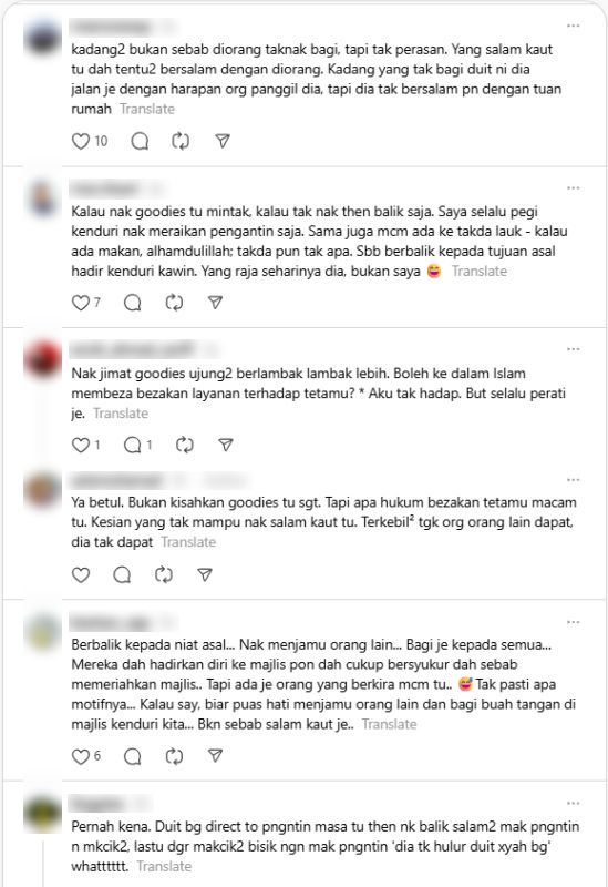 "Bukan kisahkan goodies tu sangat. Tapi apa hukum bezakan tetamu macam tu. Kesian yang tak mampu nak salam kaut tu," tulisnya lagi.
