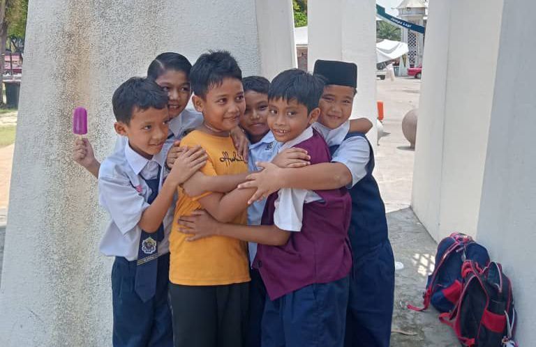Qayyim (tengah) ketika berjumpa semula rakan-rakan di sekolah yang merinduinya.