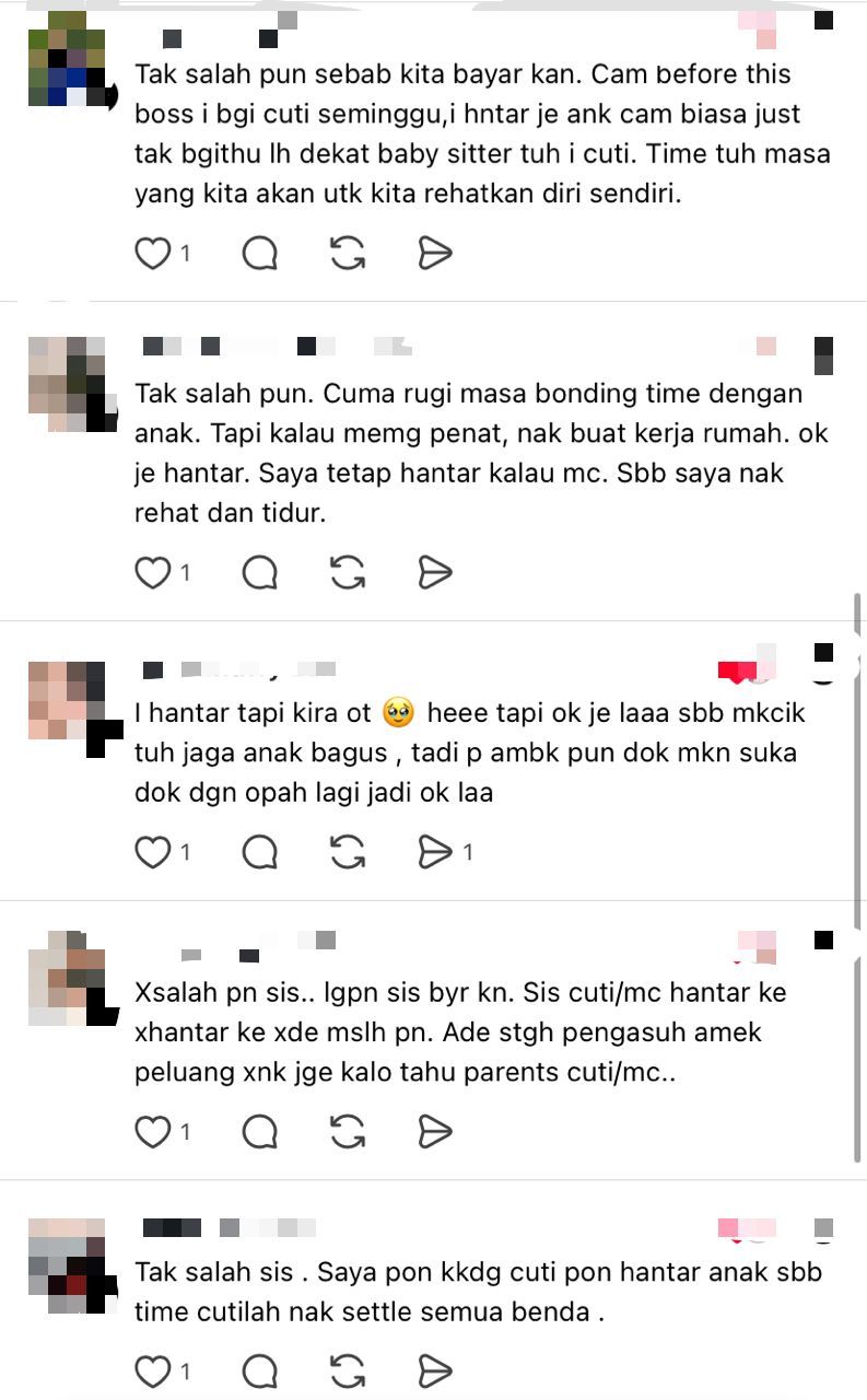 "Tak salah sis, saya kadang-kadang cuti pun hantar anak sebab masa cutilah nak selesaikan semua benda," komen beberapa netizen.