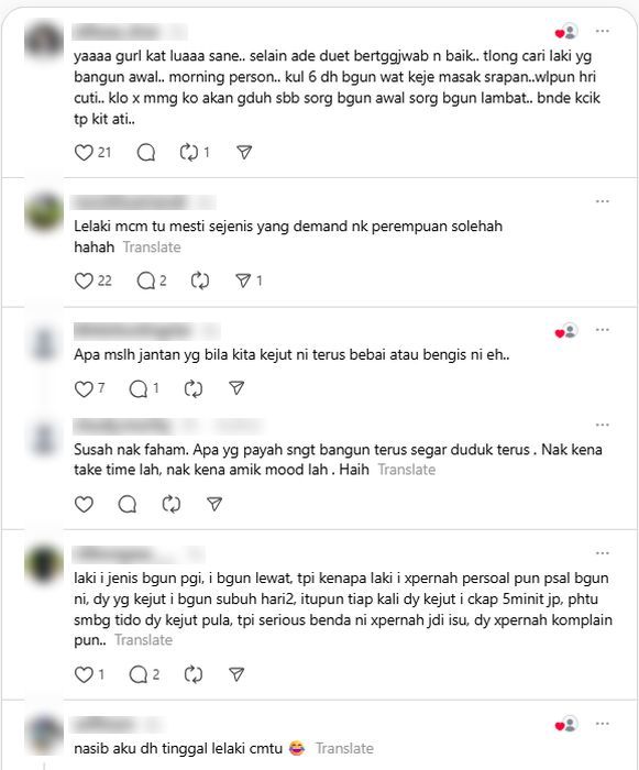 "Tolonglah kahwin dengan orang yang rajin bangun pagi! Yang setiap kali bangun tak bengis. Aku menyesal jumpa lelaki pemalas bangun, 'alarm' macam nak mampus bunyi pun tak bangun.