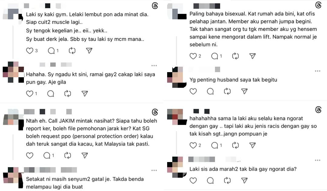 "Suami awak tak bagi reaksi apa-apa ke masa kena ngurat tu? Kalau suami saya mau kena belasah, hentak gay tu. Orang laki pantang dengan gay ni, jatuh maruah kalau kena ngurat.