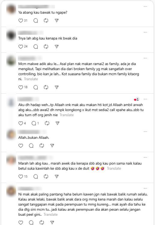 Seorang individu tidak puas teman wanita abangnya sering ikut pulang ke rumah keluarga walaupun belum berkahwin.
