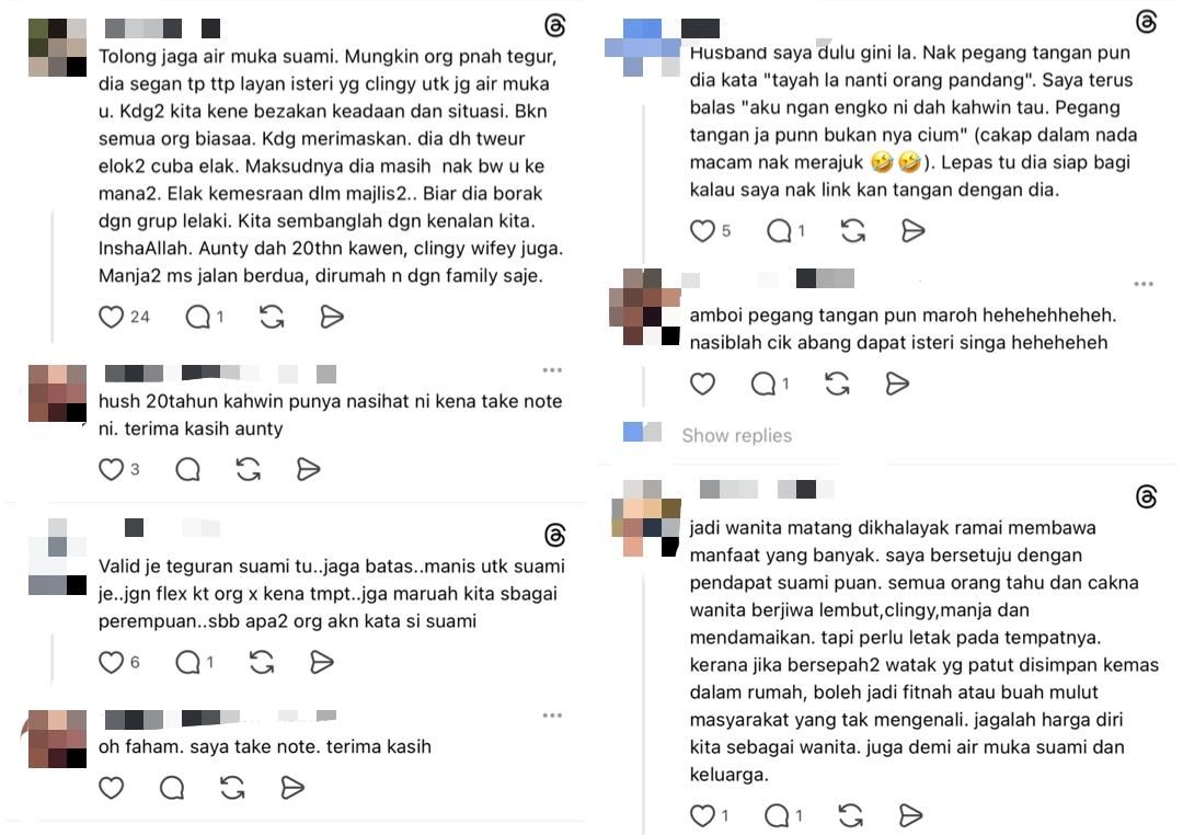 "Tapi suami cakap tak elok clingy depan orang ramai. Boleh mendatangkan fitnah dan trigger kepada orang yang pandang," luah wanita itu dalam satu hantaran di Threads.