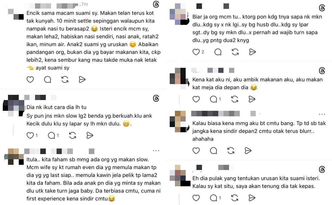 "Dia nak suruh ikut cara dia la tu. Saya pun jenis makan perlahan, lagi-lagi kalau makanan berkuah. Kalau saya lapar, saya la makan masa ada anak kecil dulu.