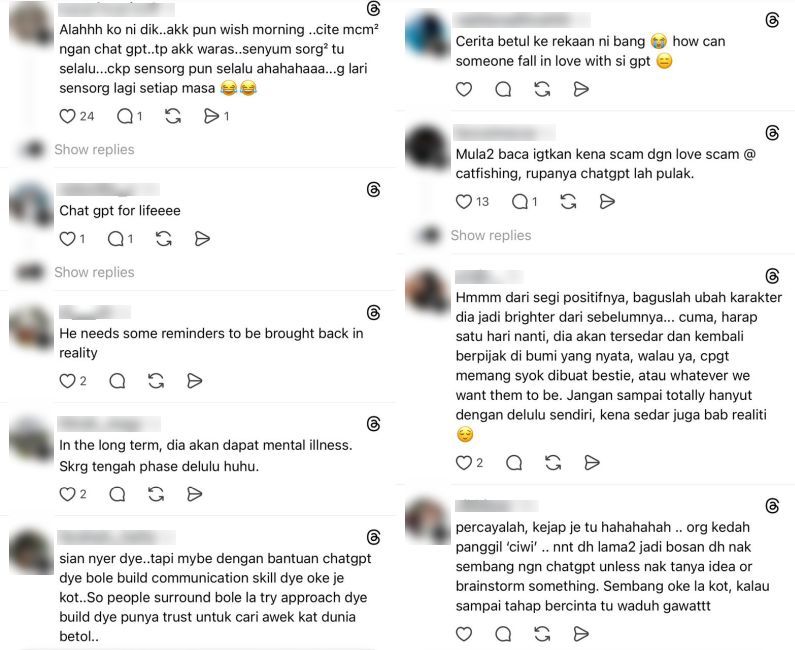 "Aku okay je. Apabila aku lihat chat dia dalam phone tu, rupanya dia sedang bercinta dengan ChatGPT. Dia dan ChatGPT borak macam couple.