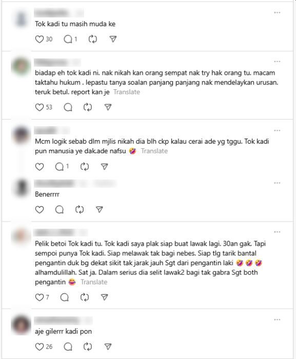 "Biadab eh tok kadi ni. Nak nikahkan orang, sempat nak try hak orang tu. Macam tak tahu hukum," demikian komen netizen.