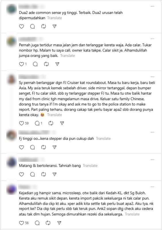 "Aku pun berhenti dekat tepi jalan sekali dengan kereta depan tu. Aku salam dengan owner kereta tu, minta maaf dan mengaku salah," tulisnya dalam hantaran di Threads.