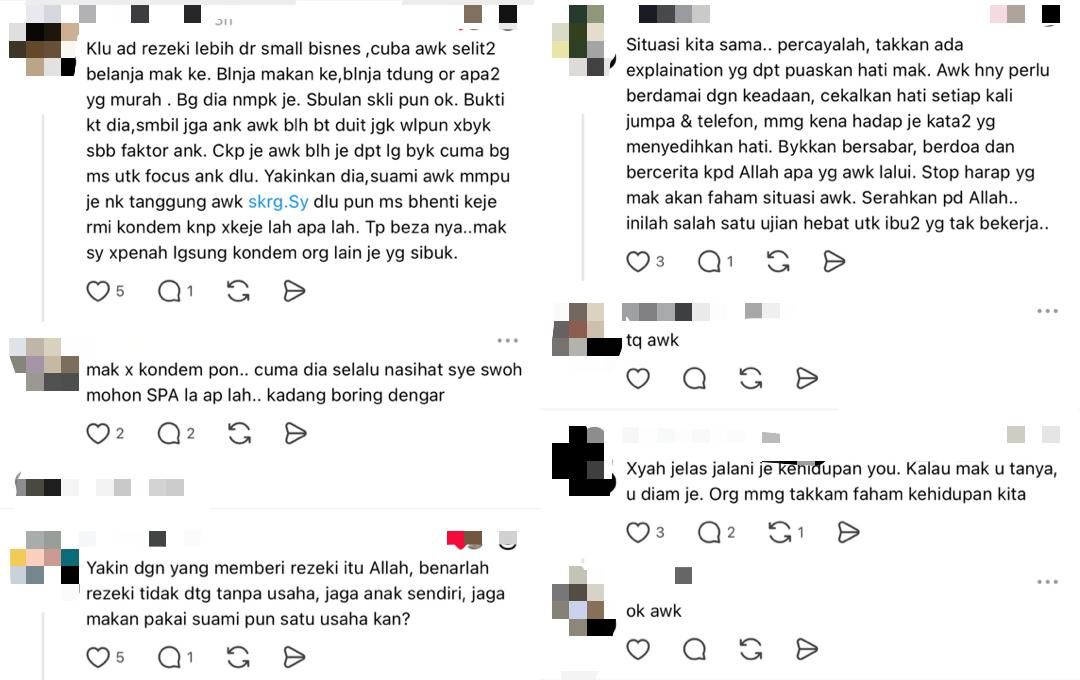 "Yakin dengan yang memberi rezeki iaitu Allah. Benarlah rezeki tidak datang tanpa usaha. Jaga anak sendiri, jaga makan dan pakai suami pun satu usaha," komen beberapa netizen.
