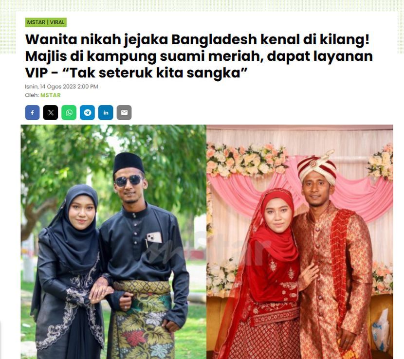 Kisah perkahwinan Nur Nadhirah Roslee, 28, dan Mohammad Samim Hossain, 27, itu turut mendapat liputan mStar pada 14 Ogos tahun yang sama.