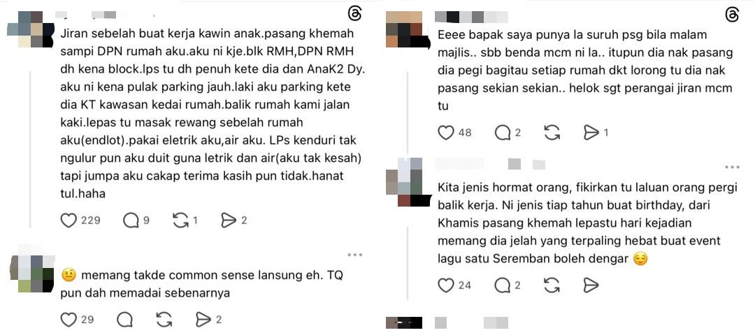 "Kenapa masih ada yang buka khemah di kawasan taman yang lorongnya sempit. Buatlah kenduri dekat dewan, padang atau masjid. Mana-mana tanah lapang boleh disewa.