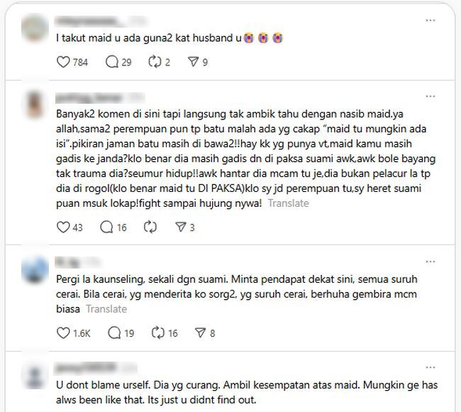"Tapi aku sedih, rasa dikhianati di rumah sendiri. Maid sudah dihantar balik ke Indonesia. Setiap hari suami aku tanpa jemu memujuk sebab aku menangis sangat teruk. Dia tak tinggal aku. Dia dekatkan diri dengan Allah," ujarnya.