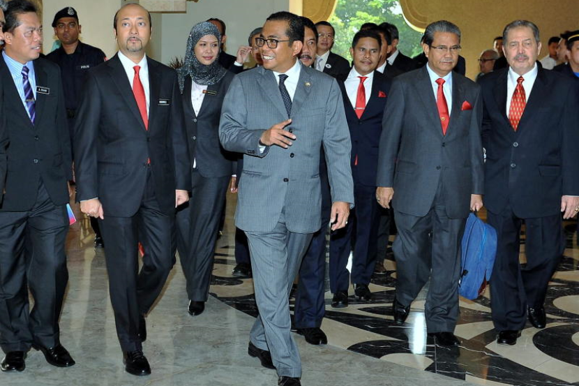Menteri Besar Johor Datuk Seri Mohamed Khaled Nordin mengiringi Menteri Besar Kedah Datuk Seri Mukhriz Mahathir ketika menghadiri mesyuarat bersama ahli-ahli majlis mesyuarat kerajaan negeri Johor dan Kedah di Bangunan Sultan Ismail, Kota Iskandar, Nusajaya di Johor Baru pada Selasa.
