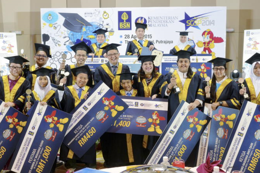 Ketua Jabatan Peruncitan dan Perniagaan Komuniti Bank Simpanan Nasional (BSN) Datuk Mearia Hamzah (empat, kanan) bersama para pelajar yang memenangi Skim Galakan Simpanan Pelajar (SGSP) bagi kategori individu pada majlis penyampaian hadiah SGSP BSN itu hari ini. Turut hadir Timbalan Ketua Eksekutif Sokongan Korporat BSN Siew Kim Meng (tiga dari kanan)