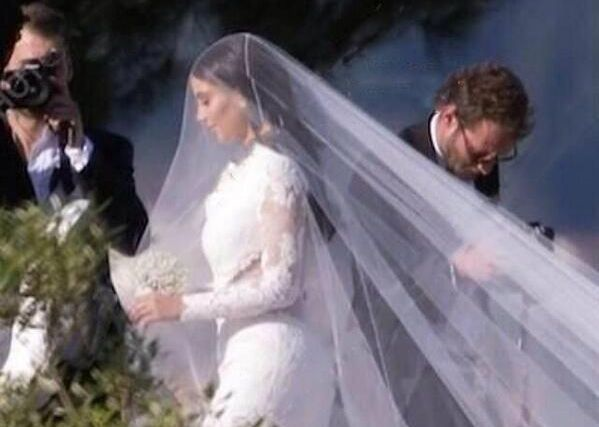 Menurut laporan Daily Mail, Kim mengenakan gaun mewah rekaan Givenchy dan diiringi oleh bapa tirinya, Bruce Jenner untuk diserahkan kepada Kanye sebelum upacara pernikahan bermula.