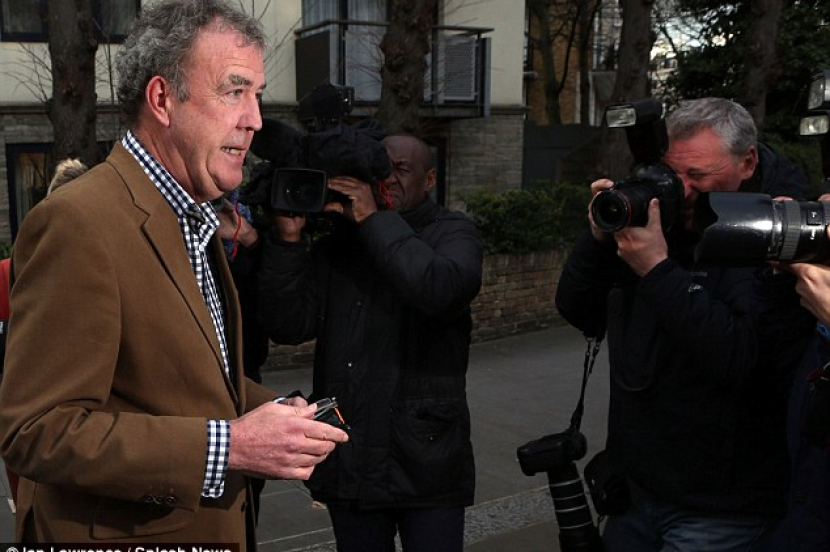 Jeremy Clarkson (kiri) ketika berhadapan dengan para wartawan berhubung isu kontroversinya bersama BBC. Dia kini dipecat sebagai hos program kereta, Top Gear.